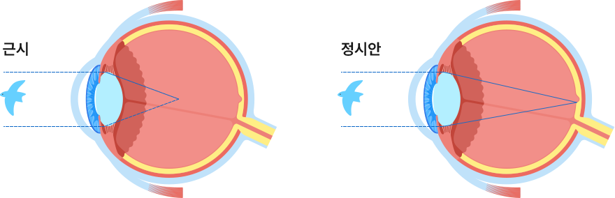 신체가 성장하면서 안구 길이가 길어지게 되는데 점점 정시가 되었다가 성장기가 되면 급격한 성장과 함께 안구 크기가 커지면서 근시가 진행됩니다.