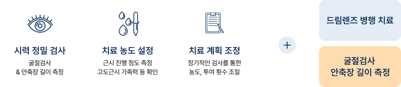 어린이 근시 치료는 근시 진행 속도가 빠른 아이들의 근시 진행 속도를 늦추고 고도근시로 이어지지 않도록 하는데 목적이 있습니다. 성장기에 고도근시 가능성이 높은 경우 안과 검진과 소아안과 전문의 진단을 통해 드림렌즈 또는 저농도 아트로핀 안약을 처방하여 근시 진행 속도를 억제하는 치료 입니다.